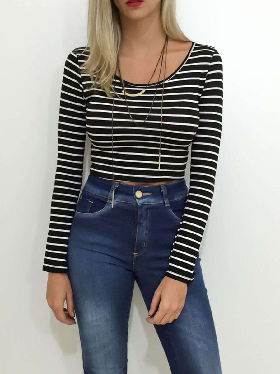 Blusa Feminina Cropped Manga Longa Maria Filo Azul Shop2gether