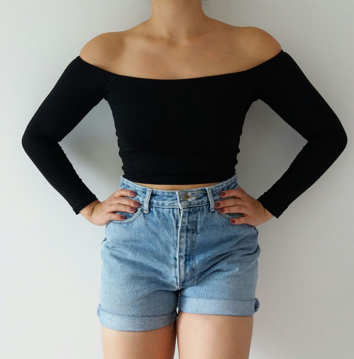 Blusa Feminina Cropped Ombro A Ombro Manga Longa Marisa