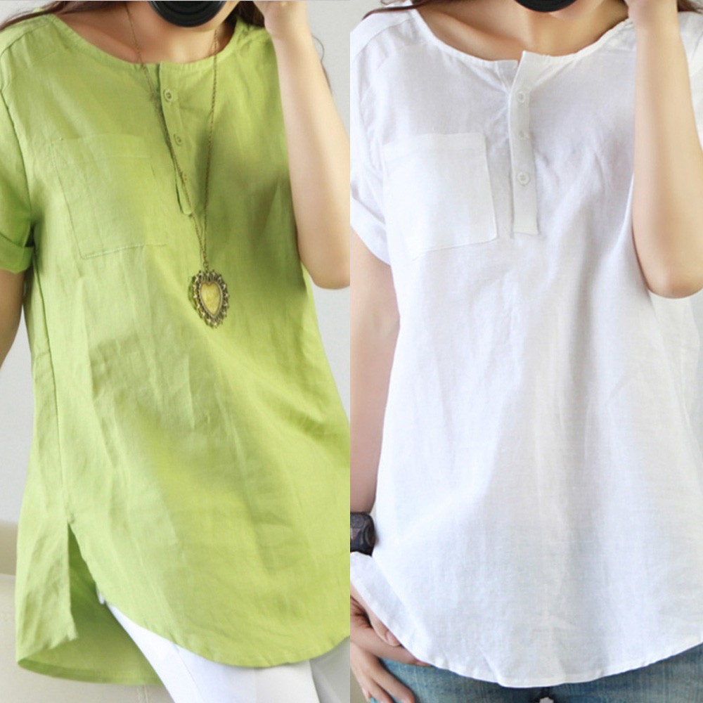 Feminina Verao Casual Manga Curta Solta Camiseta Blusa De Linho De